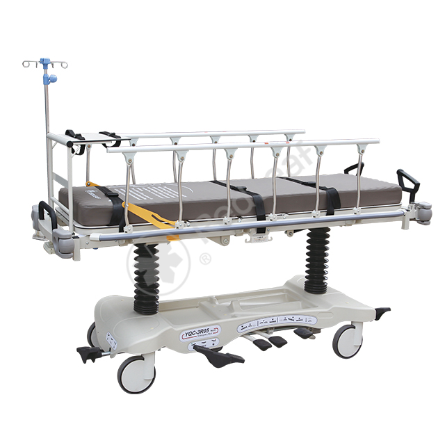 1. 具有不锈钢折叠护栏, 采用优质双液压油缸控制抢救床的高度、前后倾斜;